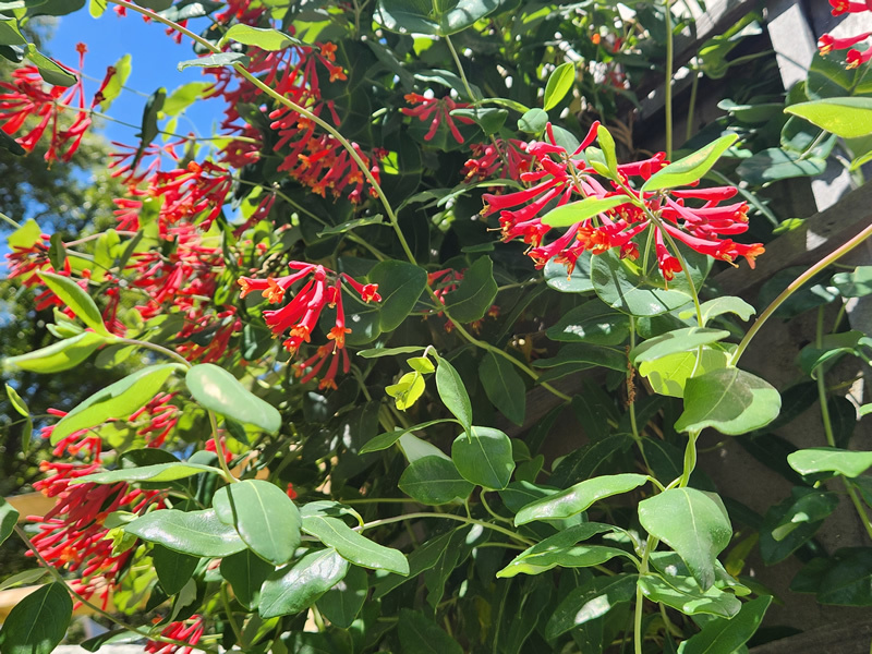Also called Coral Honeysuckle, the twining vine is a good choice for a trellis or other support structure or as a ground cover. Its tubular red flowers begin to bloom in late spring and continue blooming intermittently through summer in full sun and organically rich soil. Native to the southeast, NE populations are thought to be garden escapees. A common cultivar is “Major Wheeler” shown here.